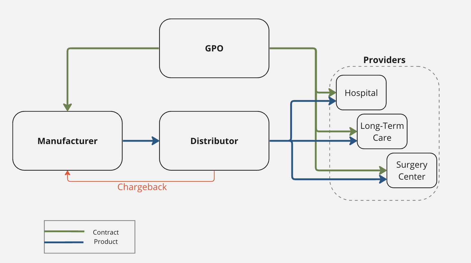 - Group Purchasing Organizations (GPOs) aggregate the purchasing power of multiple healthcare providers to negotiate contracts with manufacturers on behalf of their members. These contracts are ultimately administered by the distribution partners that facilitate the movement of products from the manufacturer to the provider.