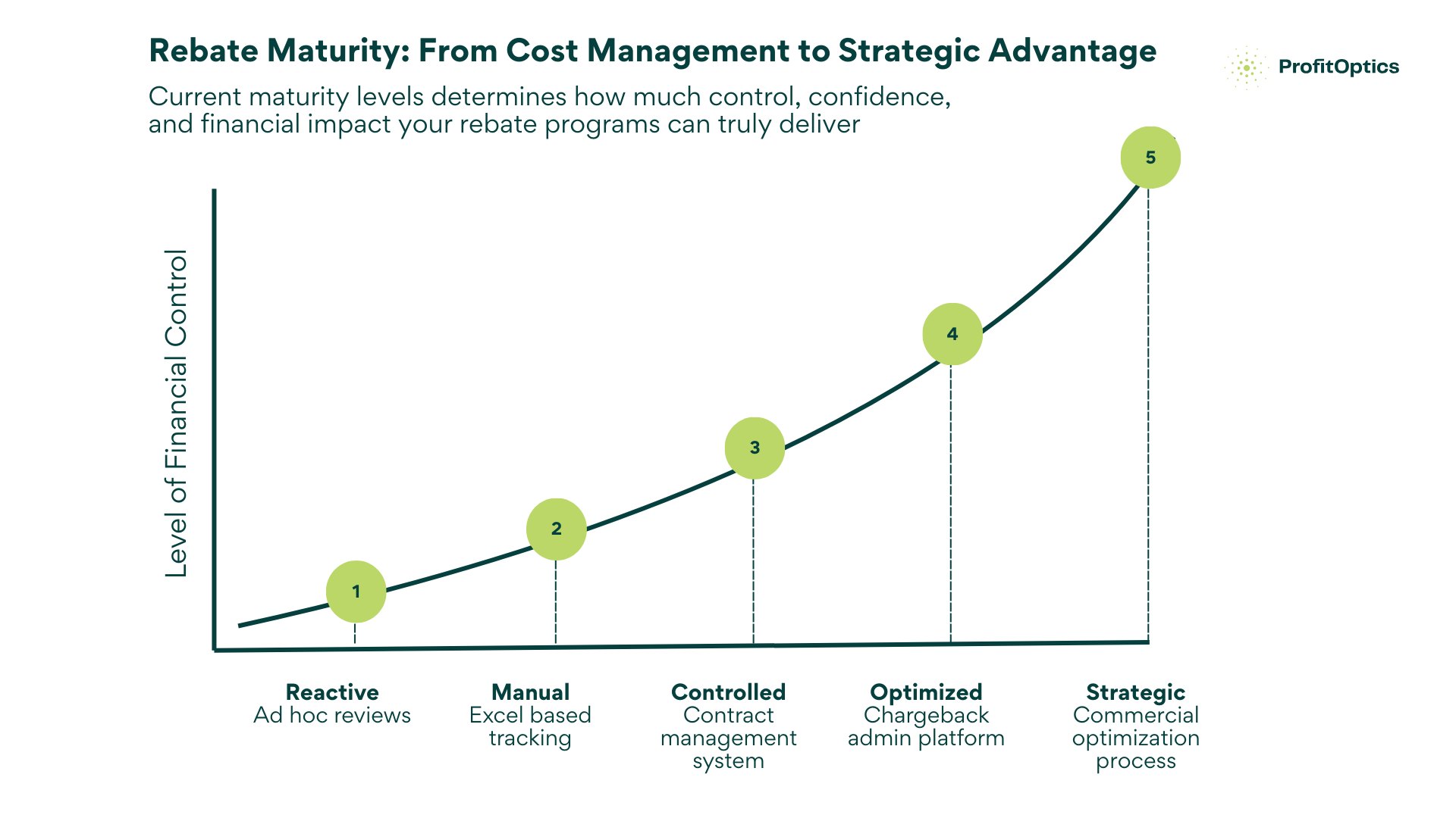 The maturity model supports that shift. It helps organizations move from reacting to issues, to enforcing rules, to using rebate insight as a source of leverage rather than uncertainty.